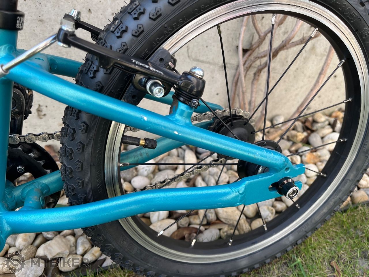 Váha bicykla 5.7 kg. Vymenený zadný plášť. Po dvoch deťoch, so škrabancami ale plne funkčný.