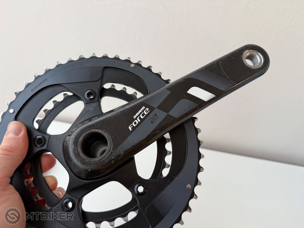 Karbonové kliky SRAM Force 22, délka 175 mm, 100% funkční, esteticky nesou větší známky použití - viz fotky. Převodníky 50/34z mají najeto přibližně 2000 km. Rozhodl jsem se sjednotit délky klik na všech kolech. Váha 680 g.